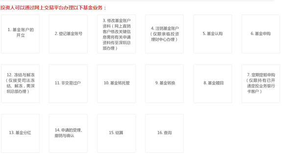 投資人可以通過網(wǎng)上交易平臺(tái)辦理以下基金業(yè)務(wù):