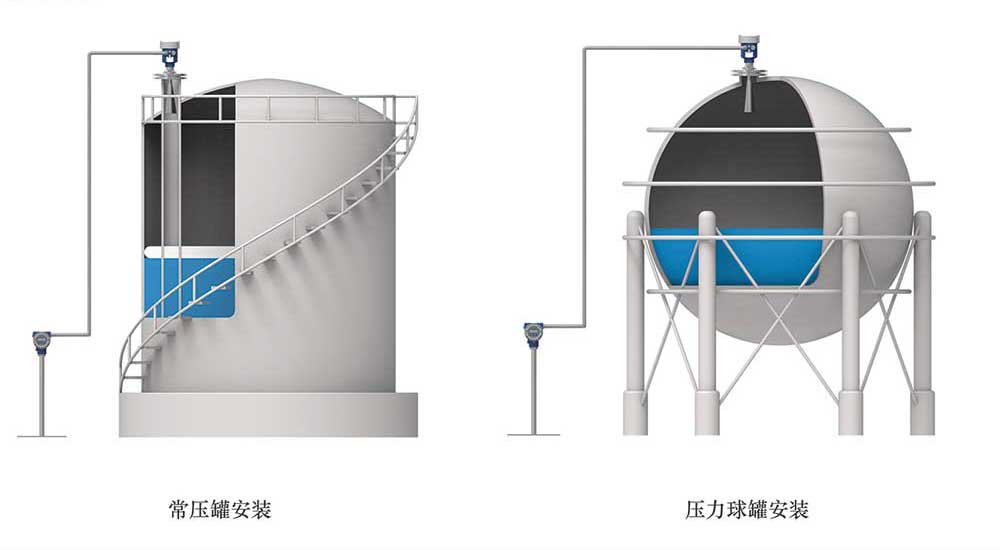 安裝要求:一般采用標(biāo)準(zhǔn)法蘭安裝到罐頂,也可采用旁通管安裝,導(dǎo)波管安裝等多種方式。高頻雷達放置在罐體直徑的1/4或1/6處,距罐壁不小于200mm,26G天線伸入到罐里至少10mm;測量錐形罐體,應(yīng)安裝在錐形罐體平面的中間,保證可以測量到錐形頂部;測量有堆料的罐體,法蘭選型應(yīng)選擇萬向法蘭(可調(diào)節(jié)方向)。