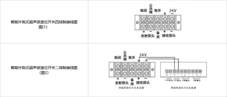 選擇安裝位置、清理罐璧油漆污垢、將專用的粘接劑少許涂抹在安裝底座、按照預(yù)定的位置安裝底座。待底座安裝完畢后,風(fēng)干后將探頭傳感器涂抹耦合劑安裝于底座上。將兩個探頭傳感器的連接線通過防爆軟管和鍍鋅管接入液位開關(guān)變送器中,按照接線端示意圖接線。